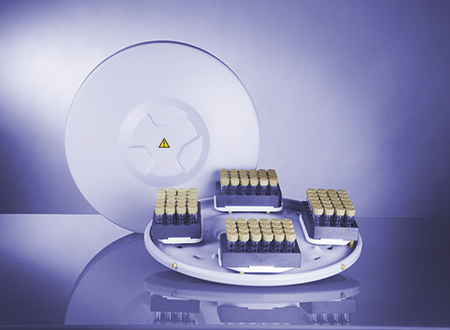 轉子 4X24MG5 是專為克量級引物生產以及在微波合成法中優化平行方法而設計。其可靠的設置具有 96 個一次性玻璃樣品瓶,這些樣品瓶均在具有便利的 6x4 矩陣模塊的 ANSI 格式碳化硅塊中排列,并可在高達 200 °C 和 20 bar 的反應條件下應用。實際上,由于碳化硅具有非凡的熱容量,單一容器和非吸收性溶劑可被高效處理。還可以有效地處理選配的樣品瓶處理工具,該工具能夠同時對一組四個樣品瓶進行排氣和承載。